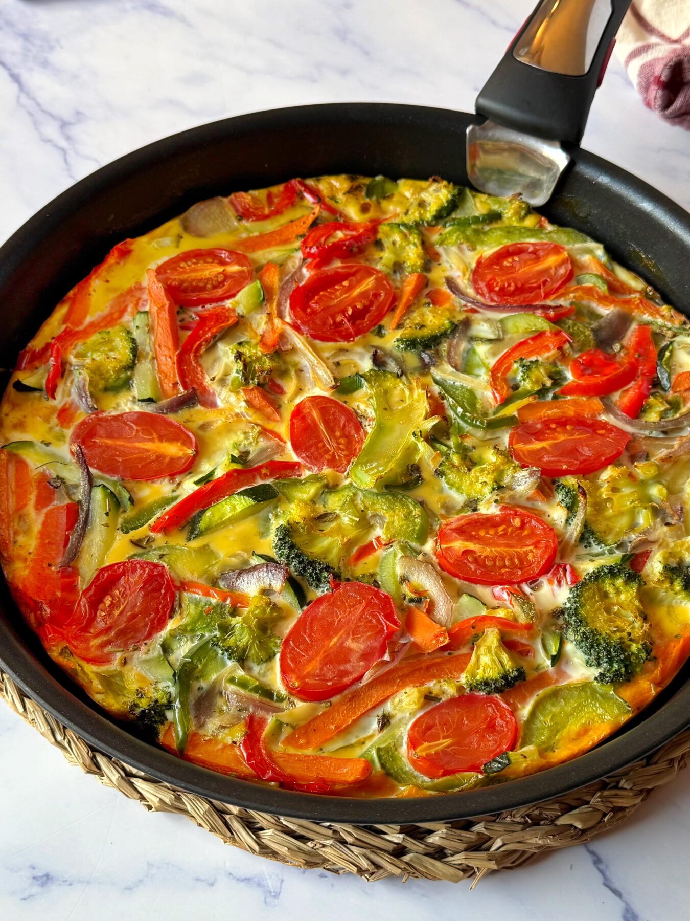 5. Vierte la mezcla de huevo y verduras sobre la base de boniato y añade unos tomates cherrys partidos por la mitad.